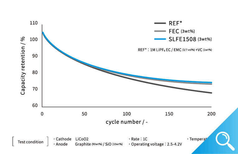 SLFE1508 significantly improves the capacity reduction caused by the Si anode expansion and contraction, which is the same improvement effect as FEC.